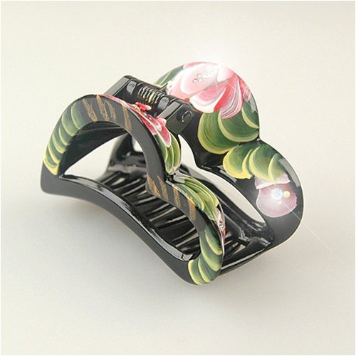 [Free Shipping] A fantasy of hand-painted flowers, pink roses perhaps, and lush leaves inch their way down every viewable space of this wearable hair art! This light and airy clip is cutout to resemble a heart when worn in the hair. The glossy-black finish is complemented with 4 iridescent hand-set crystals and tiny silver studs which are scattered around like little seeds of sparkling light in a country garden. Instantly create a feminine and romantic look for a lady of any age. . . a real heart-stopper! Eleven interlocking teeth allow room to hold up a full bouquet of fine hair or a partial swag of thicker tresses. This clip would be just darling on your "little darling" - or a thoughtful and heartfelt gift on Valentine's Day.