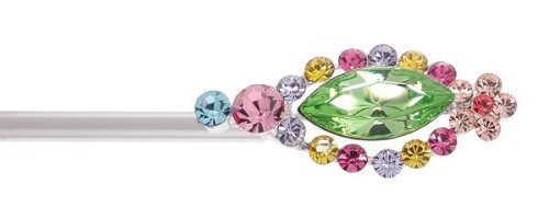 This metal hair stick decorated with Swarovski crystals measures approximately 6 inches long. The flower on the top is about 1.25 inches by 0.5 inches.